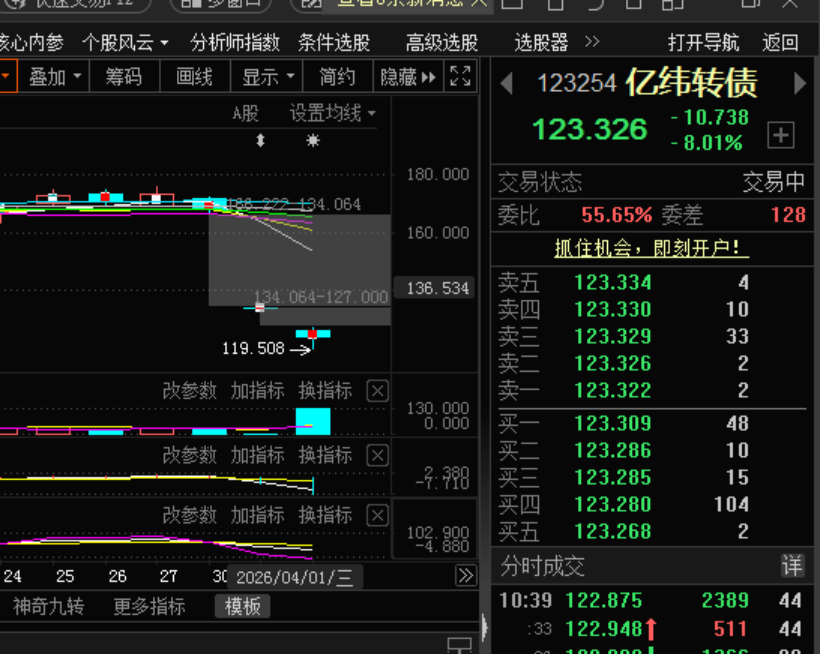 亿纬转债价格大跌主要是因为公司决定实施强赎,带来了期权价值的下降。3月31日,亿纬锂能发布公告称,公司决定提前赎回“亿纬转债”,赎回价格为100.034元/张,赎回条件满足日为2026年3月30日,赎回登记日为2026年4月23日,赎回日为2026年4月24日,全部赎回。截至2026年4月23日收市后未转股将被强制赎回,转股需开通创业板权限。