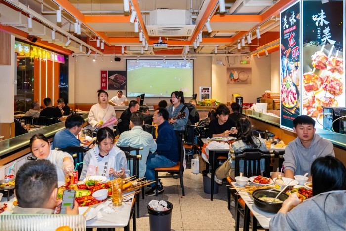 核心观赛区设在烧烤店外围,巨大的屏幕正对着露天座位区,食客们一边品尝美食,一边盯着比分变化;主力观赛点分布在七欣天广场、东广场,大屏同步直播,周围的台阶、空地,甚至临街商铺的门口都有可以驻足观球的地方,而沿街的商铺但凡有屏幕的地方,无一例外都在播放着同一场比赛。