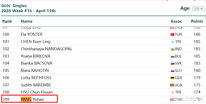 在梅斯站杨禹涵夺冠算是爆冷夺冠,杨禹涵在U15的世界排名仅仅第109位,而U15女单世界排名前十只有两人:祝启慧(第二)、刘子菱(第六),但这两位超级天才都没有来参与青少年常规赛。
