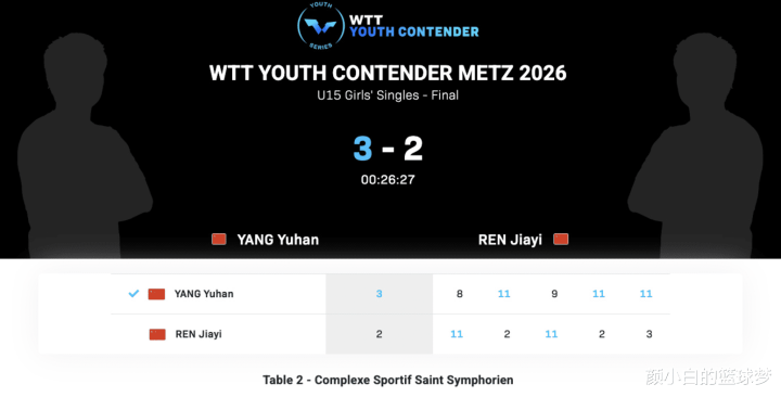 值得一提的是在六天前,2026年WTT青少年常规挑战赛卢森堡站,杨禹涵在U15女单决赛中2-3不敌队友孙笑薇拿到亚军,换言之短短的三天时间她就从亚军变为了冠军,连续两站赛事她都杀入了U15决赛,这位只有14岁的小将已经开始显露天赋。